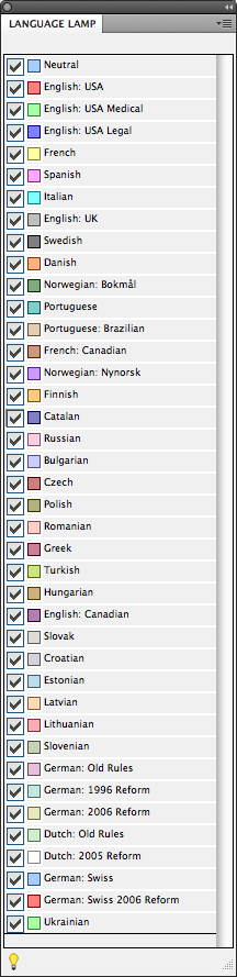Use the LanguageLamp palette to view all the languages used in your document. Check each language to turn the "lamp" on or off in your documents.